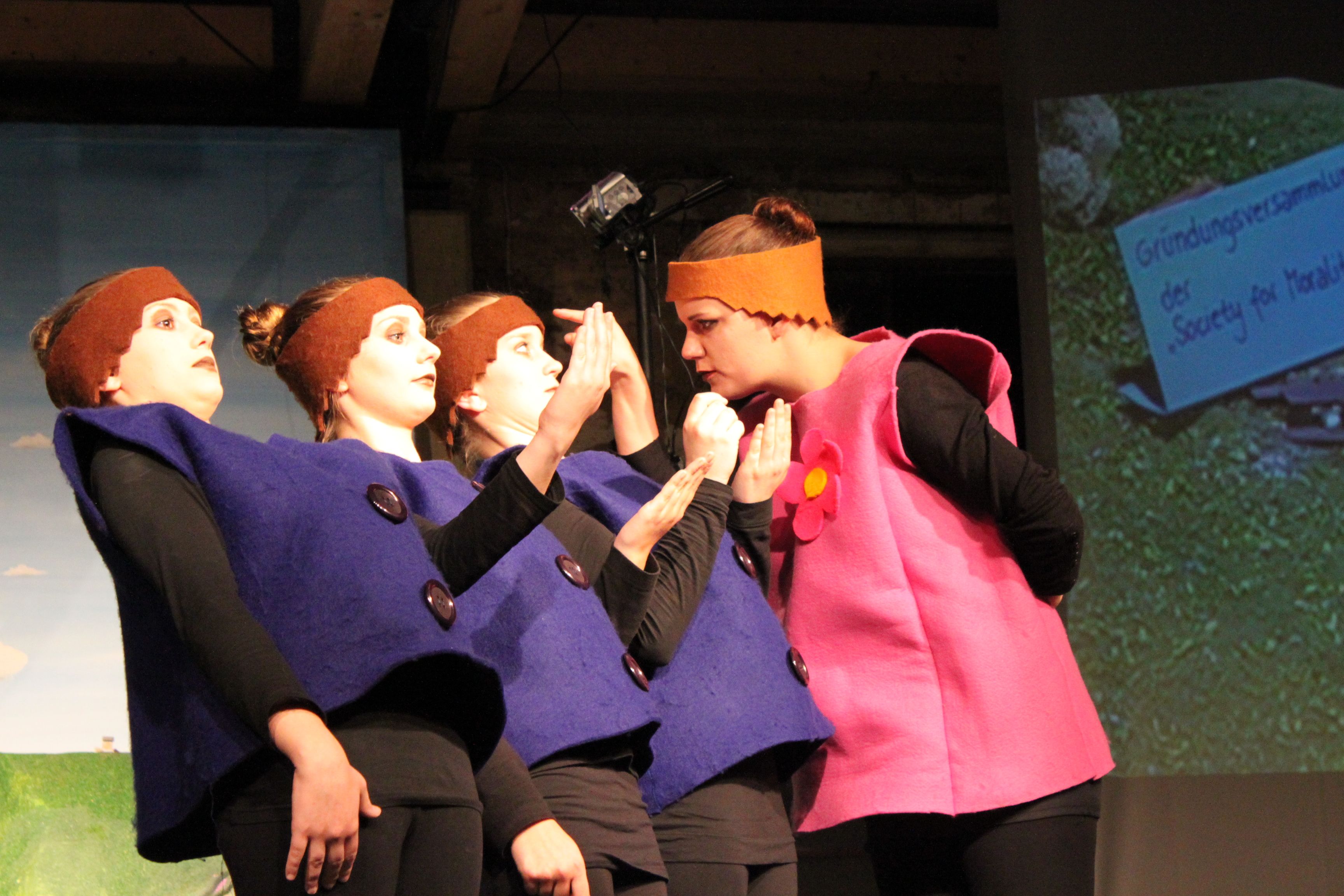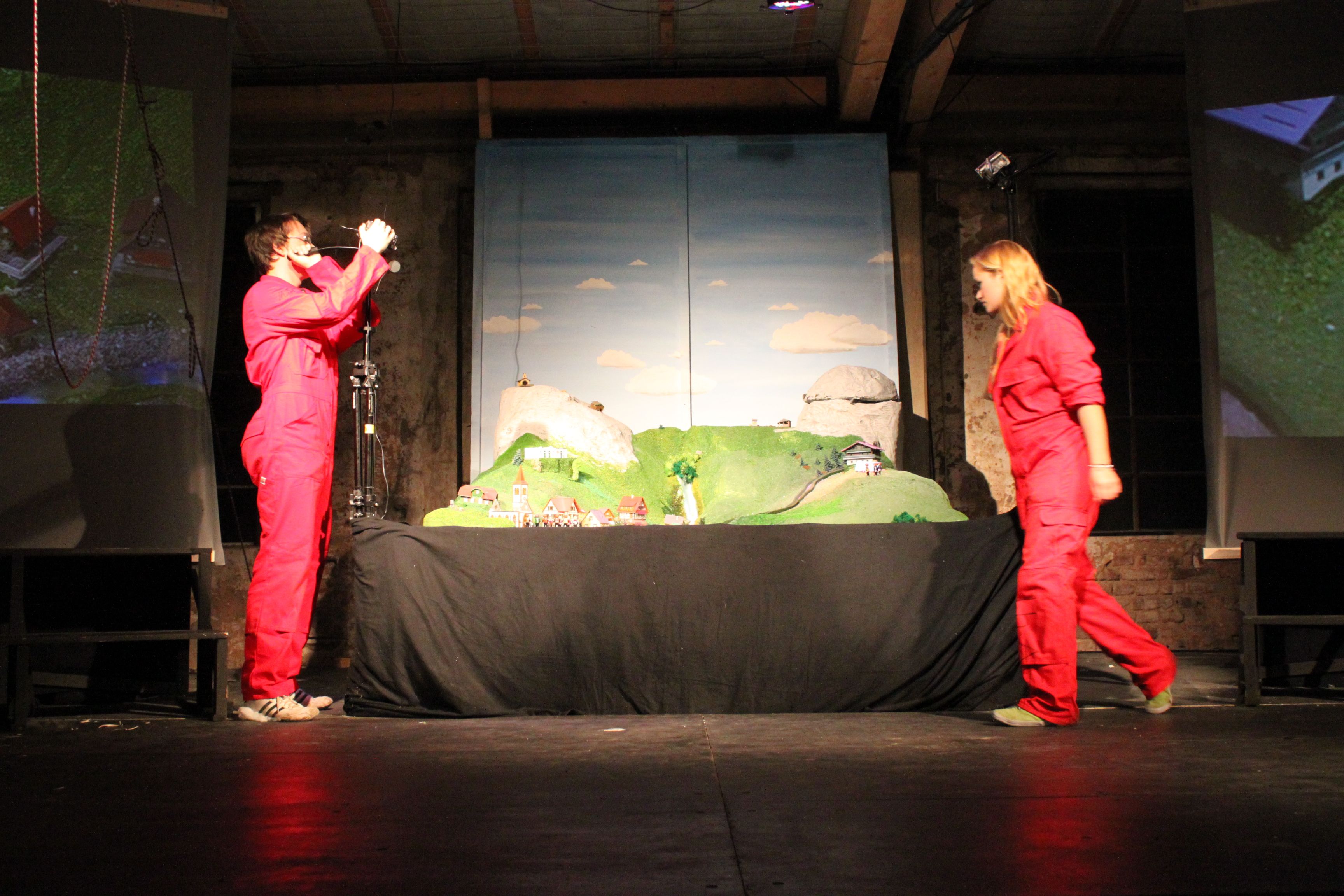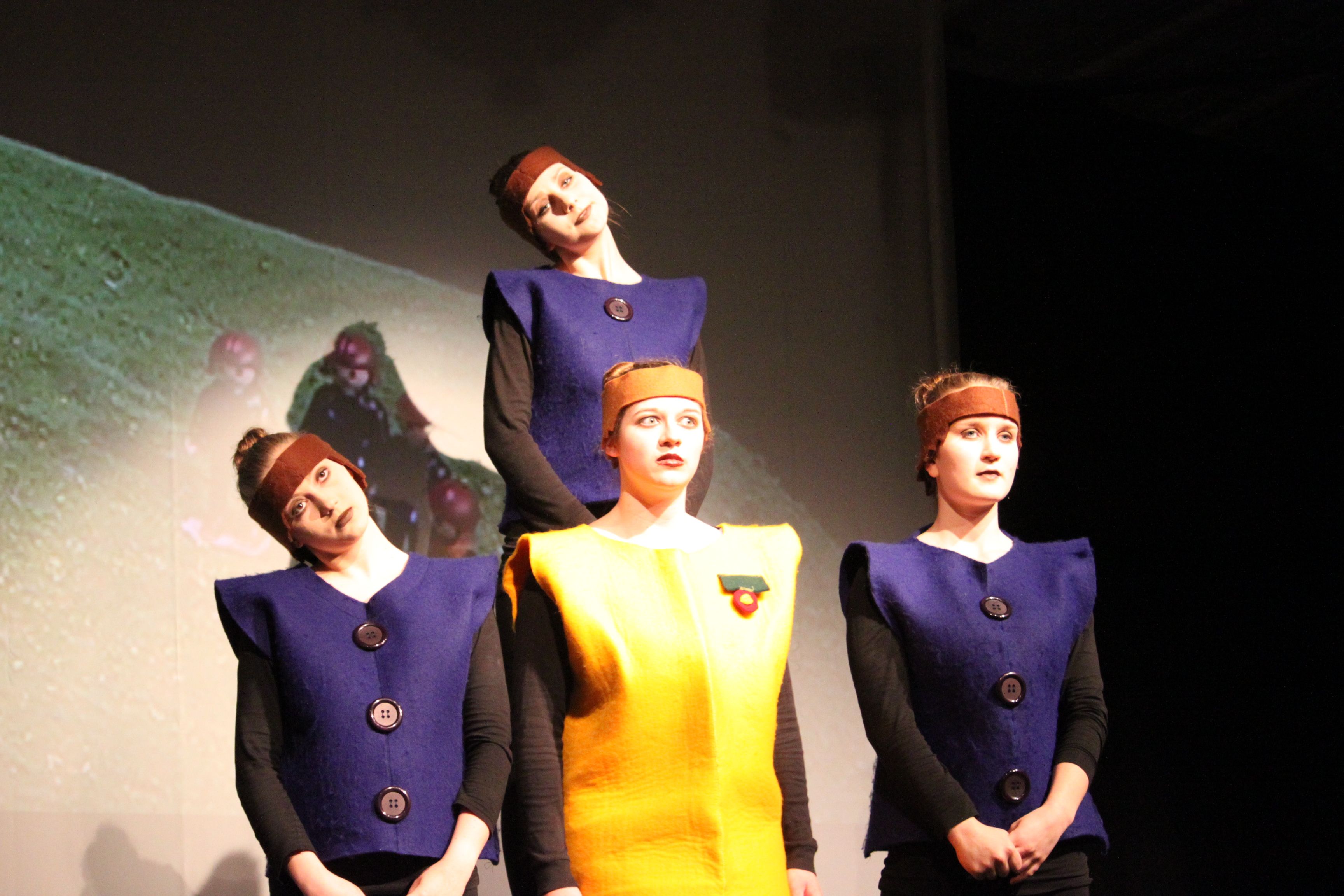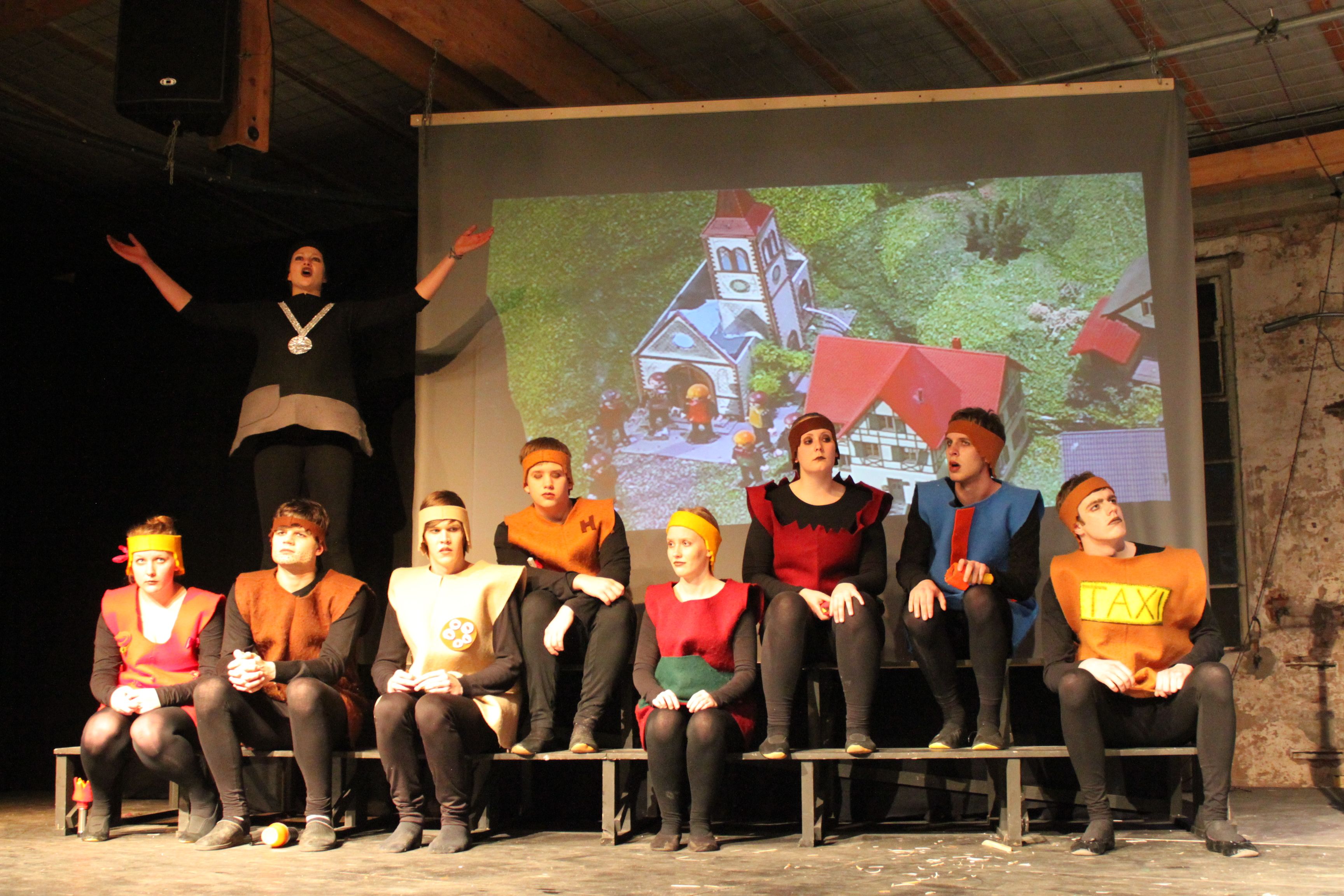 Diese Offenheit hat die Theater-AG der Edertalschule als Chance gesehen. Wir entschieden uns für zwei Spielebenen: eine als Miniaturlandschaft mit Playmobilfiguren (auf der Techniker spielen), als Spieltableau auf Großbildwände projiziert, die andere auf der großen Bühne, auf der die Darsteller in weichen, puppenartigen Filzkostümen Dürrenmatts groteske und schillernde Figuren einer doppelbödigen, morbiden Welt verkörpern. Dabei wechseln die Darsteller ihre Rollen immer wieder, signalisieren dies mit ihren Filzfarben und erreichen so, dass auch im Kollektiv ihre Charaktere individuell ausgestaltet werden können.