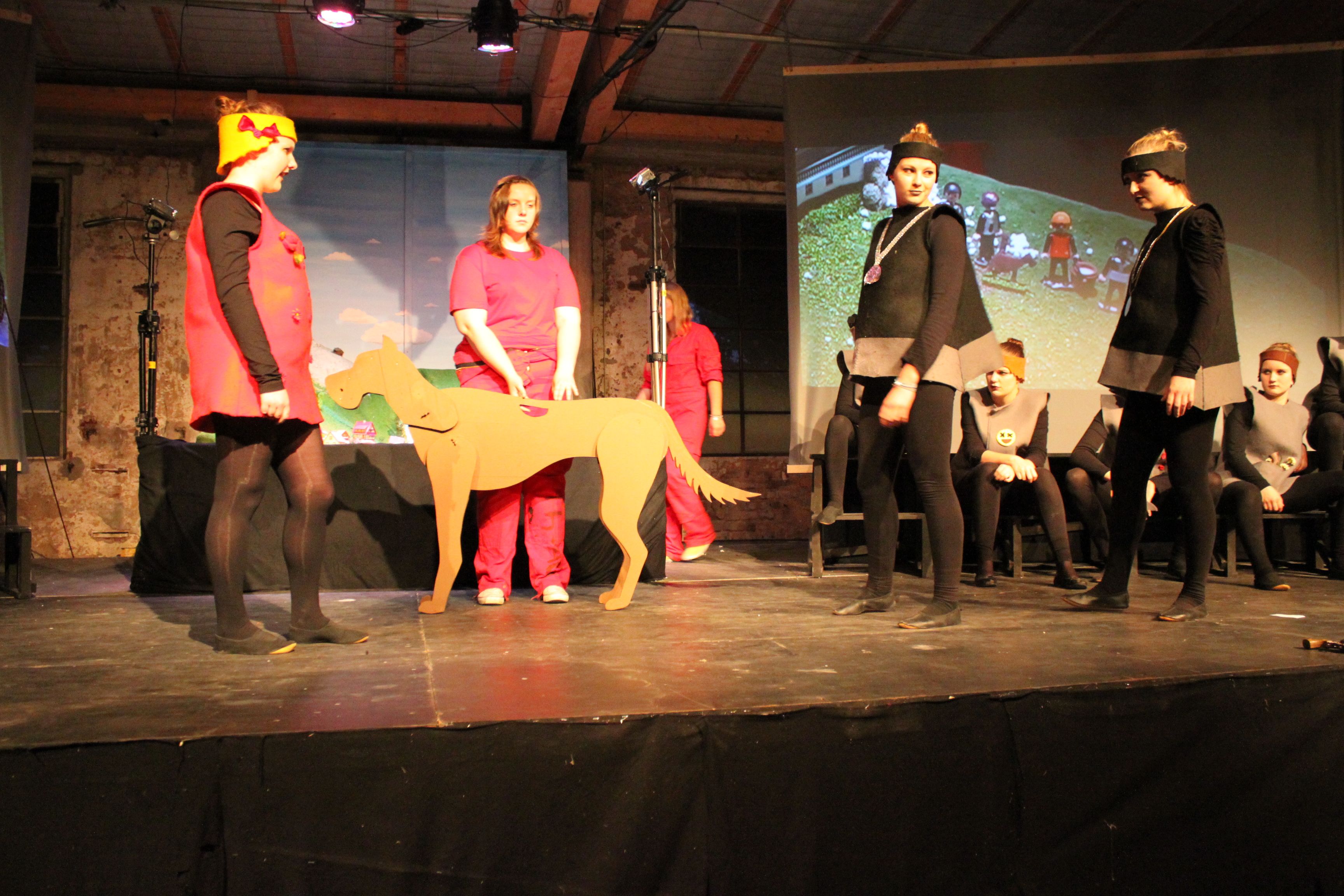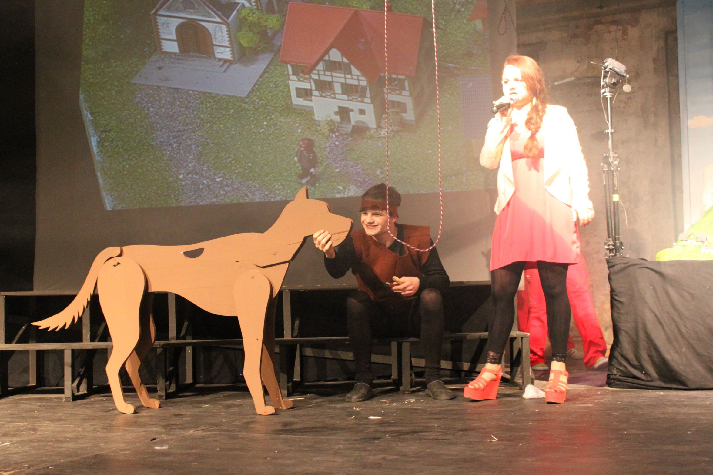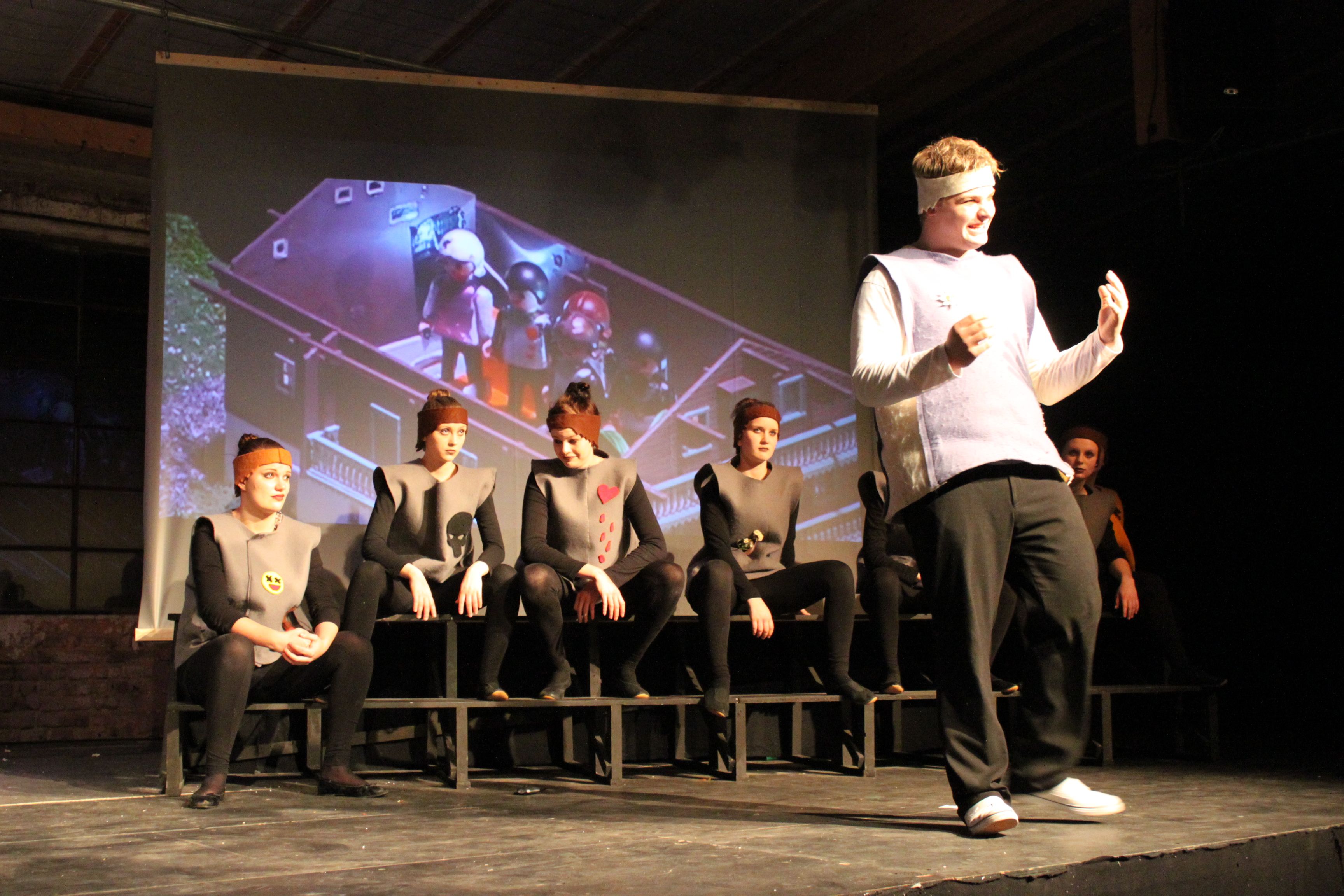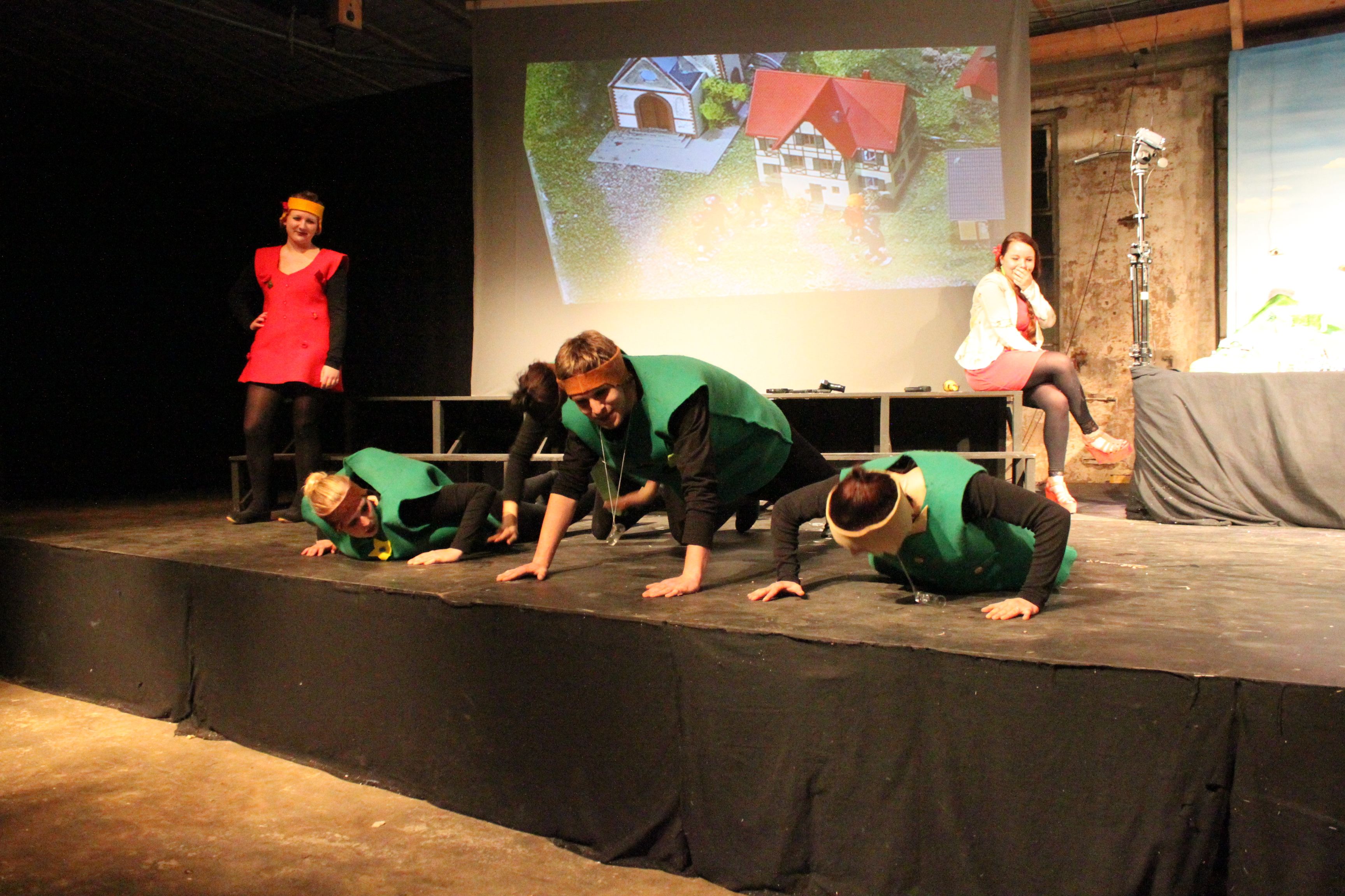 Diese Offenheit hat die Theater-AG der Edertalschule als Chance gesehen. Wir entschieden uns für zwei Spielebenen: eine als Miniaturlandschaft mit Playmobilfiguren (auf der Techniker spielen), als Spieltableau auf Großbildwände projiziert, die andere auf der großen Bühne, auf der die Darsteller in weichen, puppenartigen Filzkostümen Dürrenmatts groteske und schillernde Figuren einer doppelbödigen, morbiden Welt verkörpern. Dabei wechseln die Darsteller ihre Rollen immer wieder, signalisieren dies mit ihren Filzfarben und erreichen so, dass auch im Kollektiv ihre Charaktere individuell ausgestaltet werden können.