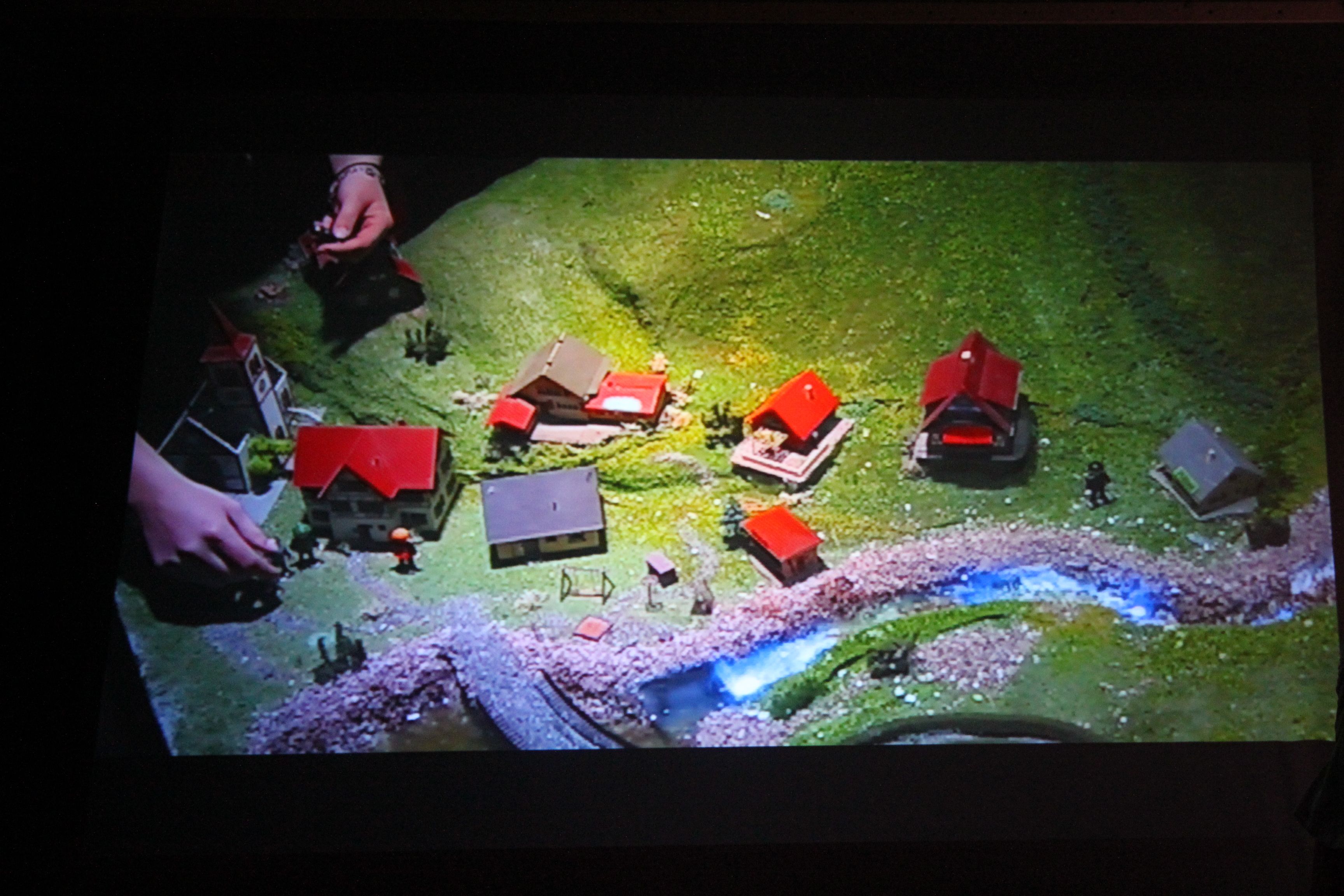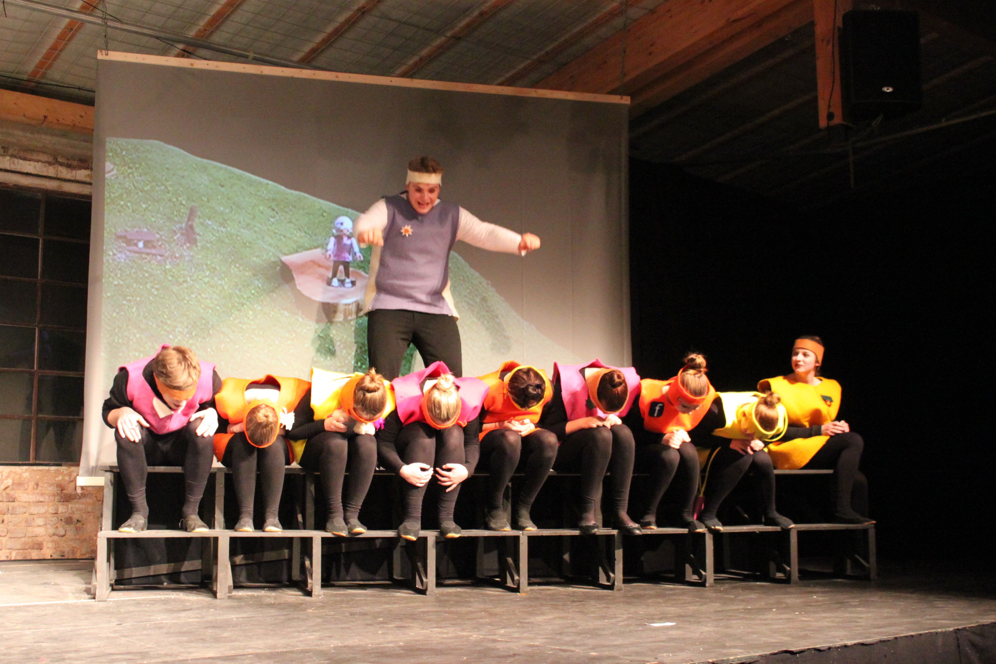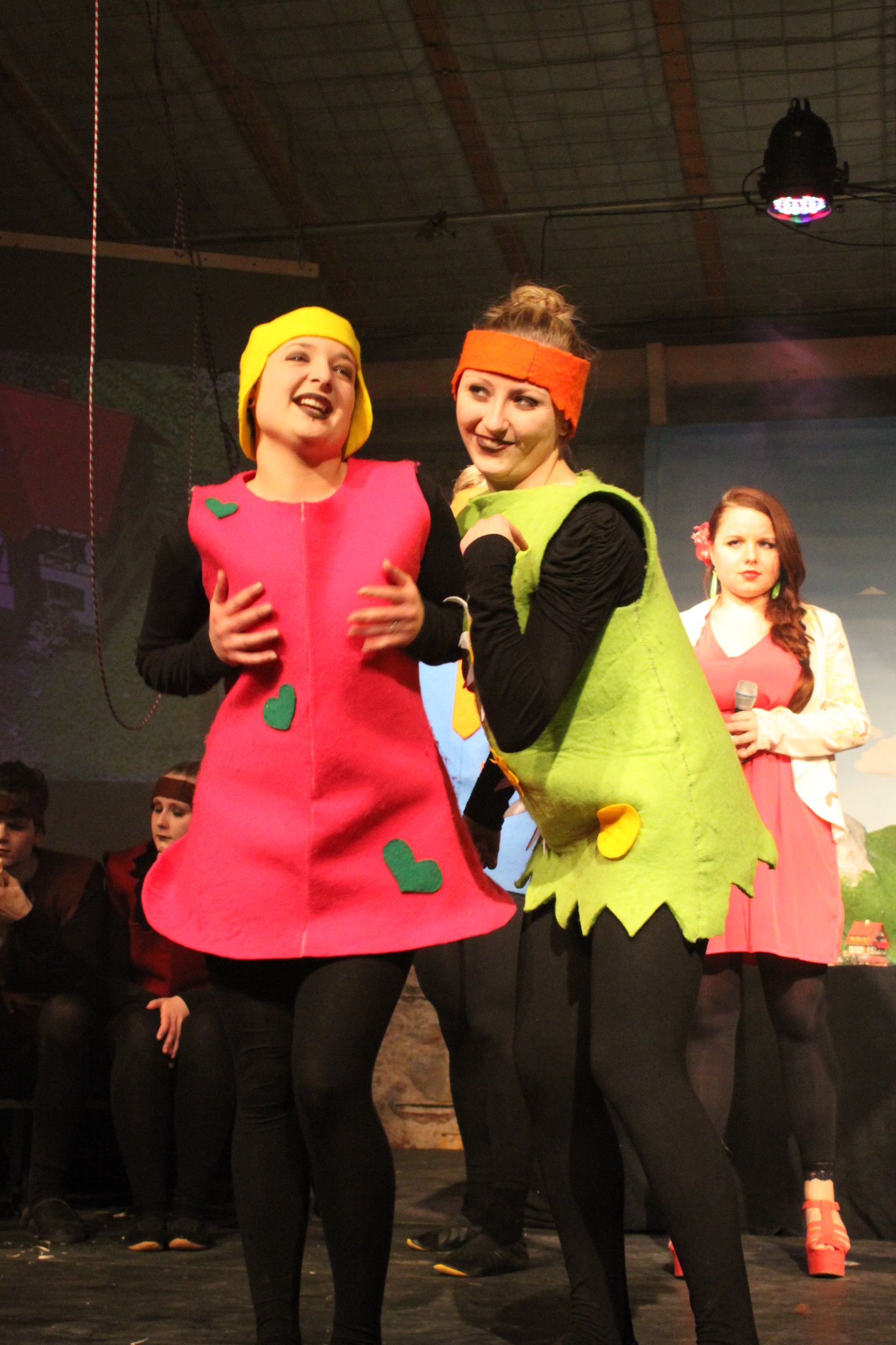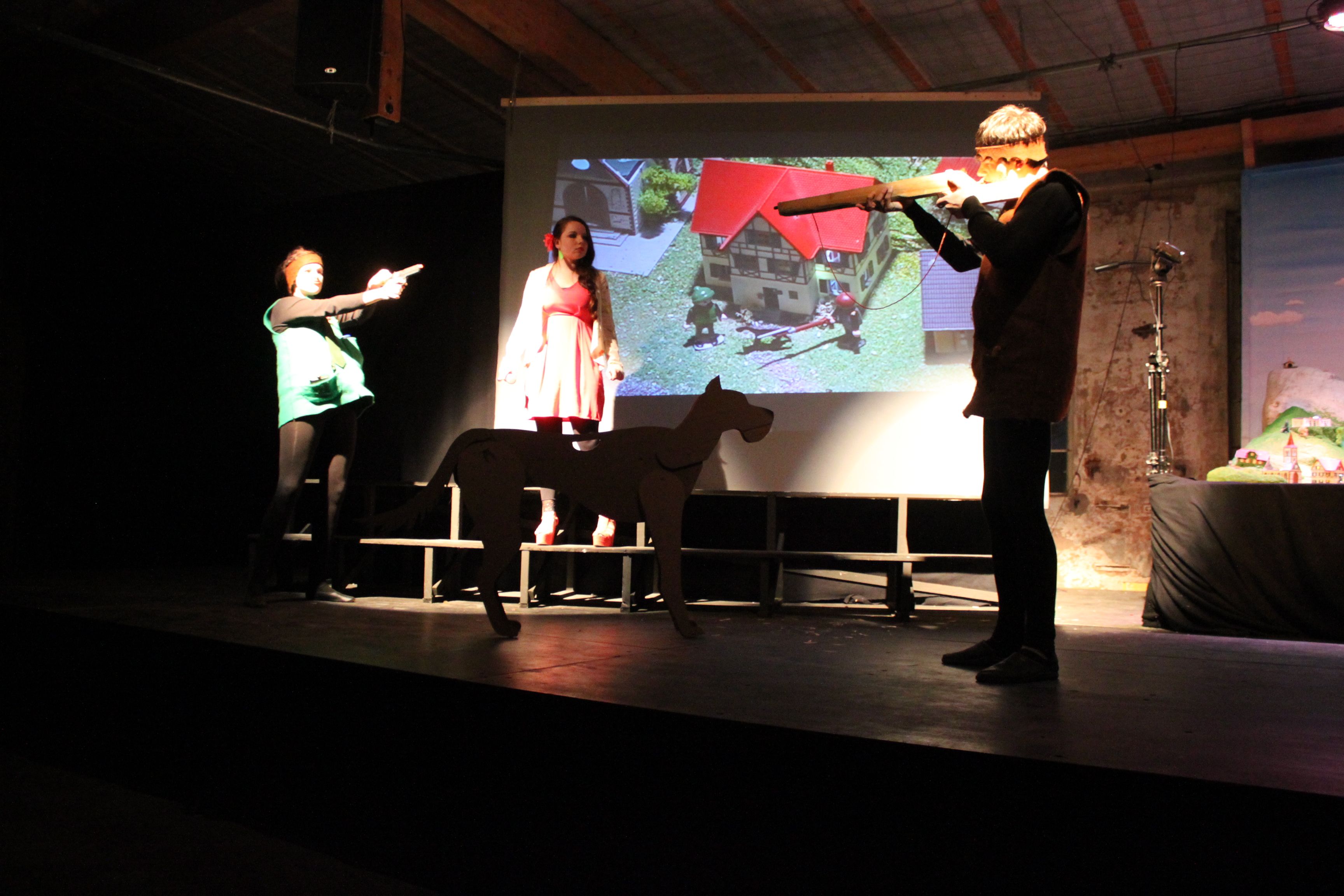 Diese Offenheit hat die Theater-AG der Edertalschule als Chance gesehen. Wir entschieden uns für zwei Spielebenen: eine als Miniaturlandschaft mit Playmobilfiguren (auf der Techniker spielen), als Spieltableau auf Großbildwände projiziert, die andere auf der großen Bühne, auf der die Darsteller in weichen, puppenartigen Filzkostümen Dürrenmatts groteske und schillernde Figuren einer doppelbödigen, morbiden Welt verkörpern. Dabei wechseln die Darsteller ihre Rollen immer wieder, signalisieren dies mit ihren Filzfarben und erreichen so, dass auch im Kollektiv ihre Charaktere individuell ausgestaltet werden können.