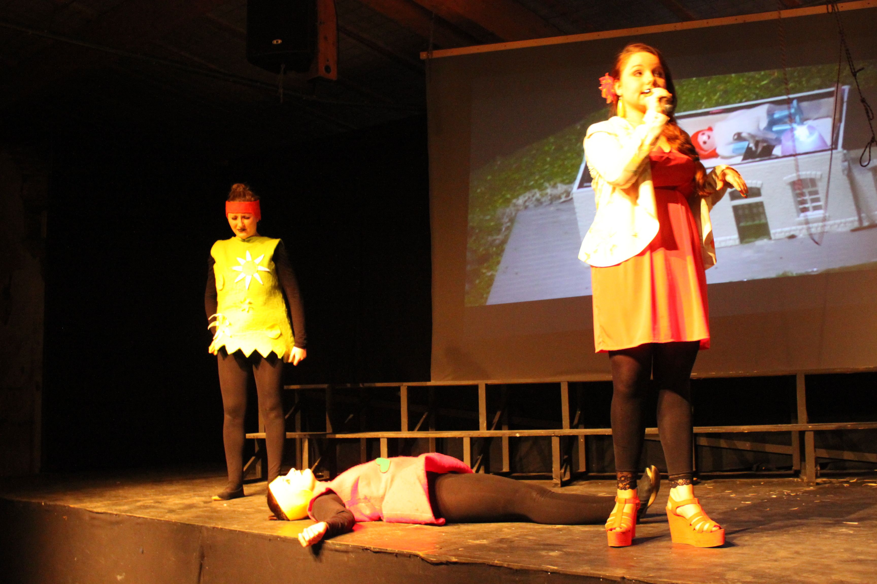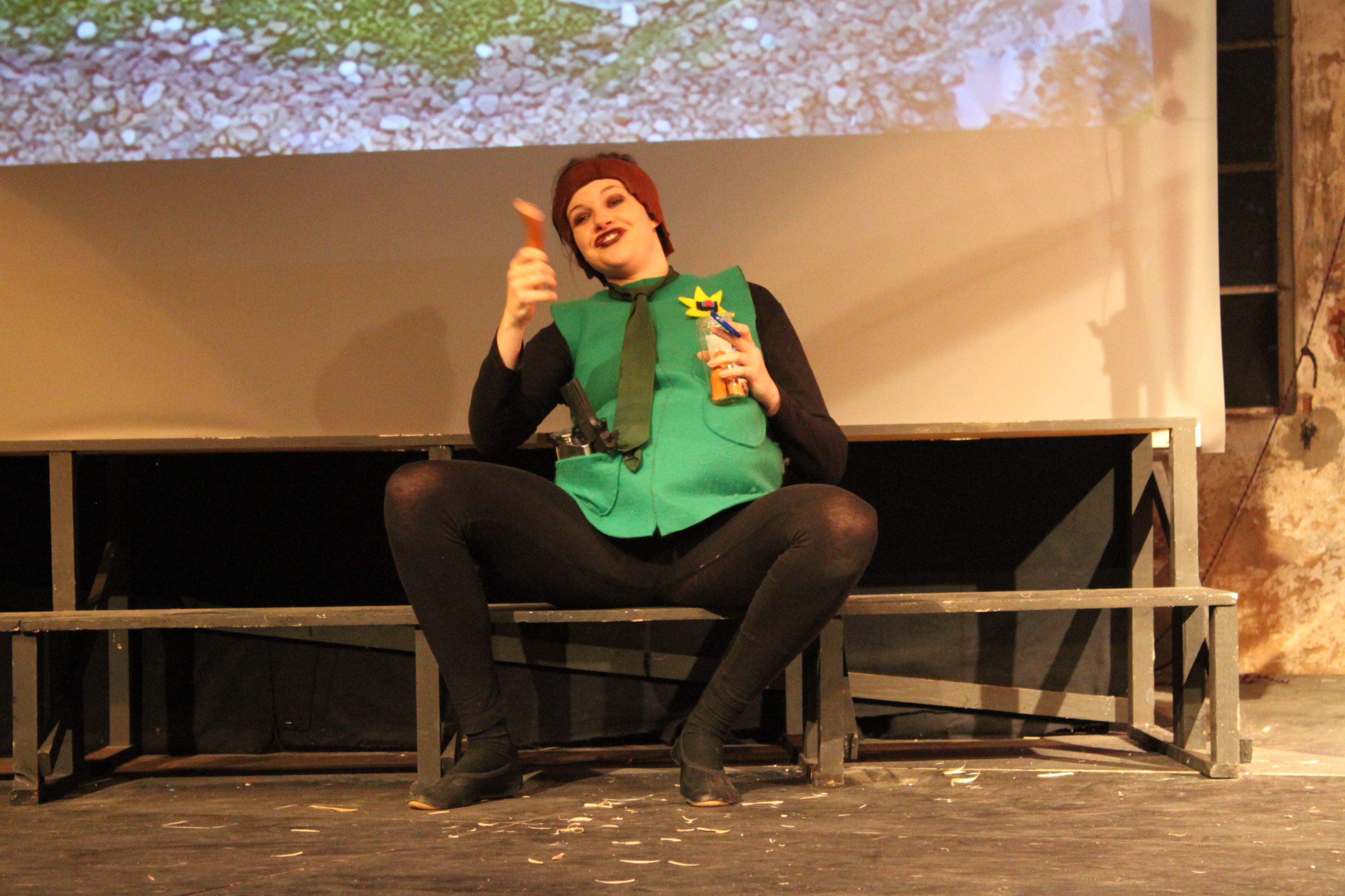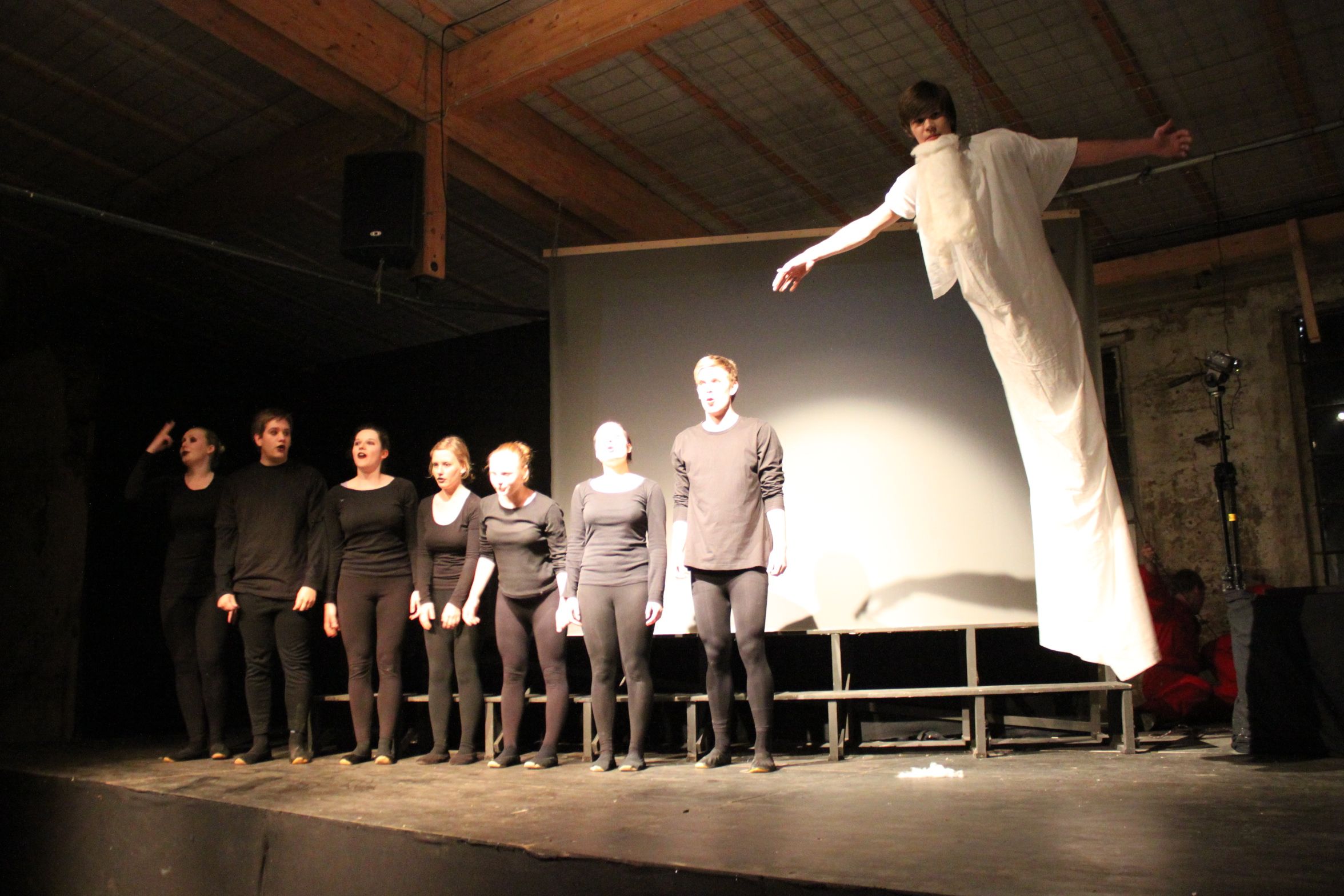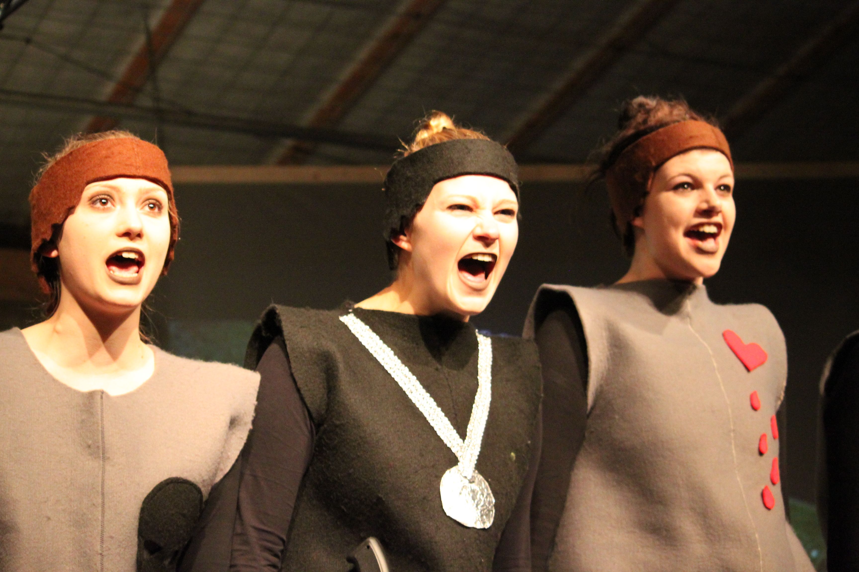 Diese Offenheit hat die Theater-AG der Edertalschule als Chance gesehen. Wir entschieden uns für zwei Spielebenen: eine als Miniaturlandschaft mit Playmobilfiguren (auf der Techniker spielen), als Spieltableau auf Großbildwände projiziert, die andere auf der großen Bühne, auf der die Darsteller in weichen, puppenartigen Filzkostümen Dürrenmatts groteske und schillernde Figuren einer doppelbödigen, morbiden Welt verkörpern. Dabei wechseln die Darsteller ihre Rollen immer wieder, signalisieren dies mit ihren Filzfarben und erreichen so, dass auch im Kollektiv ihre Charaktere individuell ausgestaltet werden können.